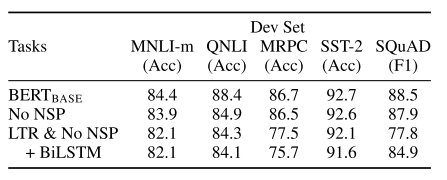 表5:使用BERTBASE架构对预训练任务的消融。“No NSP”是在没有下一个句子预测任务的情况下训练的。“LTR & No NSP”被训练成一个从左到右的LM,没有下一个句子的预测,就像OpenAI GPT一样。“BiLSTM”在微调过程中在“LTR No NSP”模型之上添加了一个随机初始化的BiLSTM。