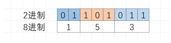 二进制011 010 11的八进制为0153,前面 要加个0区分十进制
