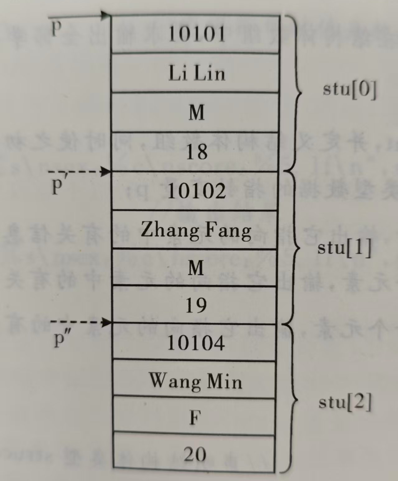 struct stu s[3] = { {1,"zhangsan",'M',18},{2,"lisi",'w',19}, {3,"wangwu",'M',20} };