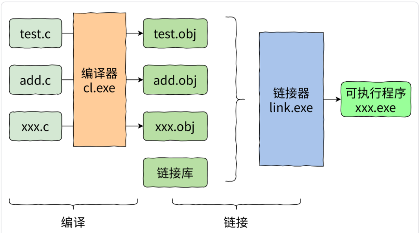 通过编译变成目标文件(计算机看得懂的),然后通过链接变成exe文件(能在内存运行的)