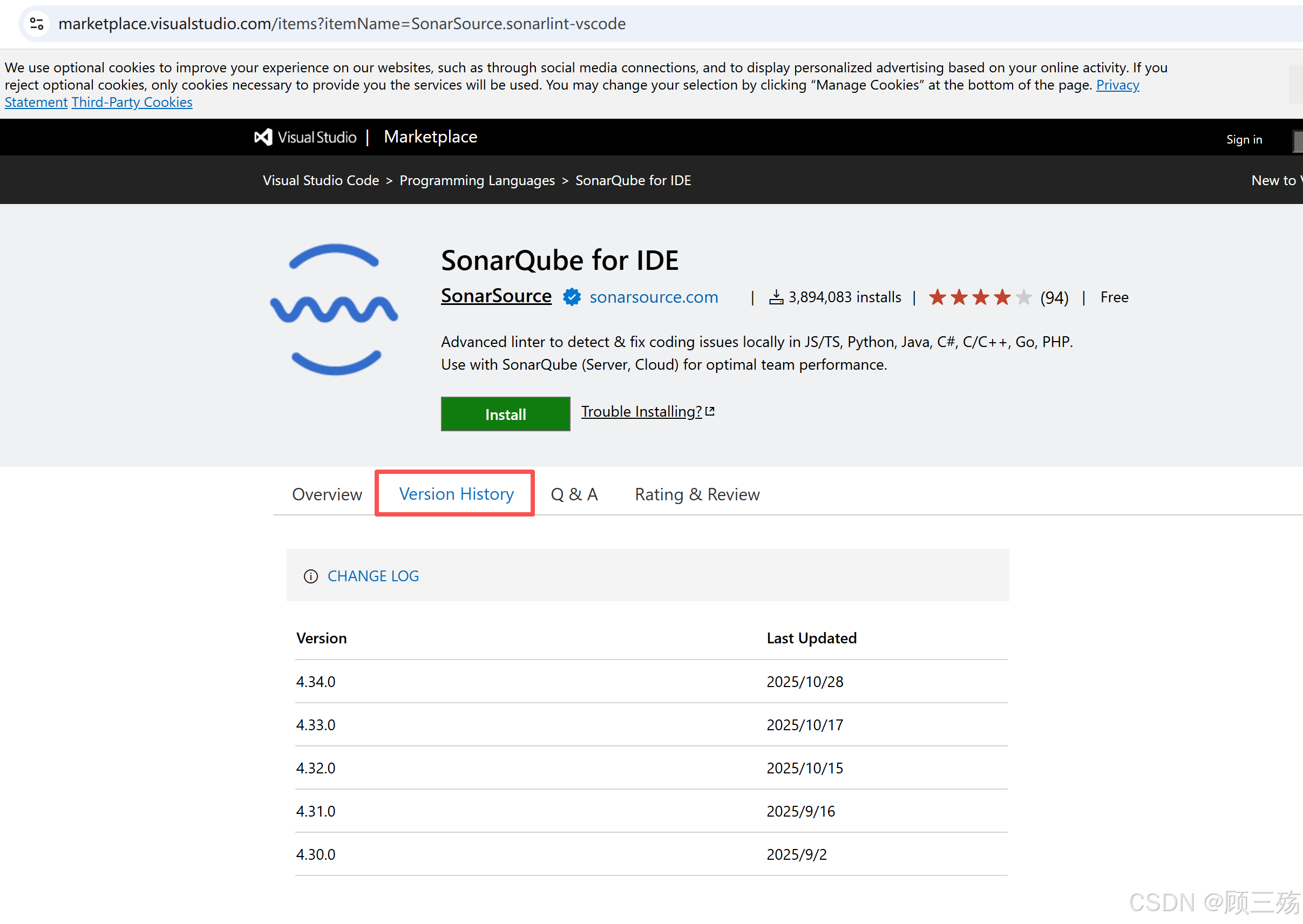 点击 Version History,结合插件页的 URL 和 Version History 中的信息,提取出以下信息(以 SonarQube for IDE 为例):