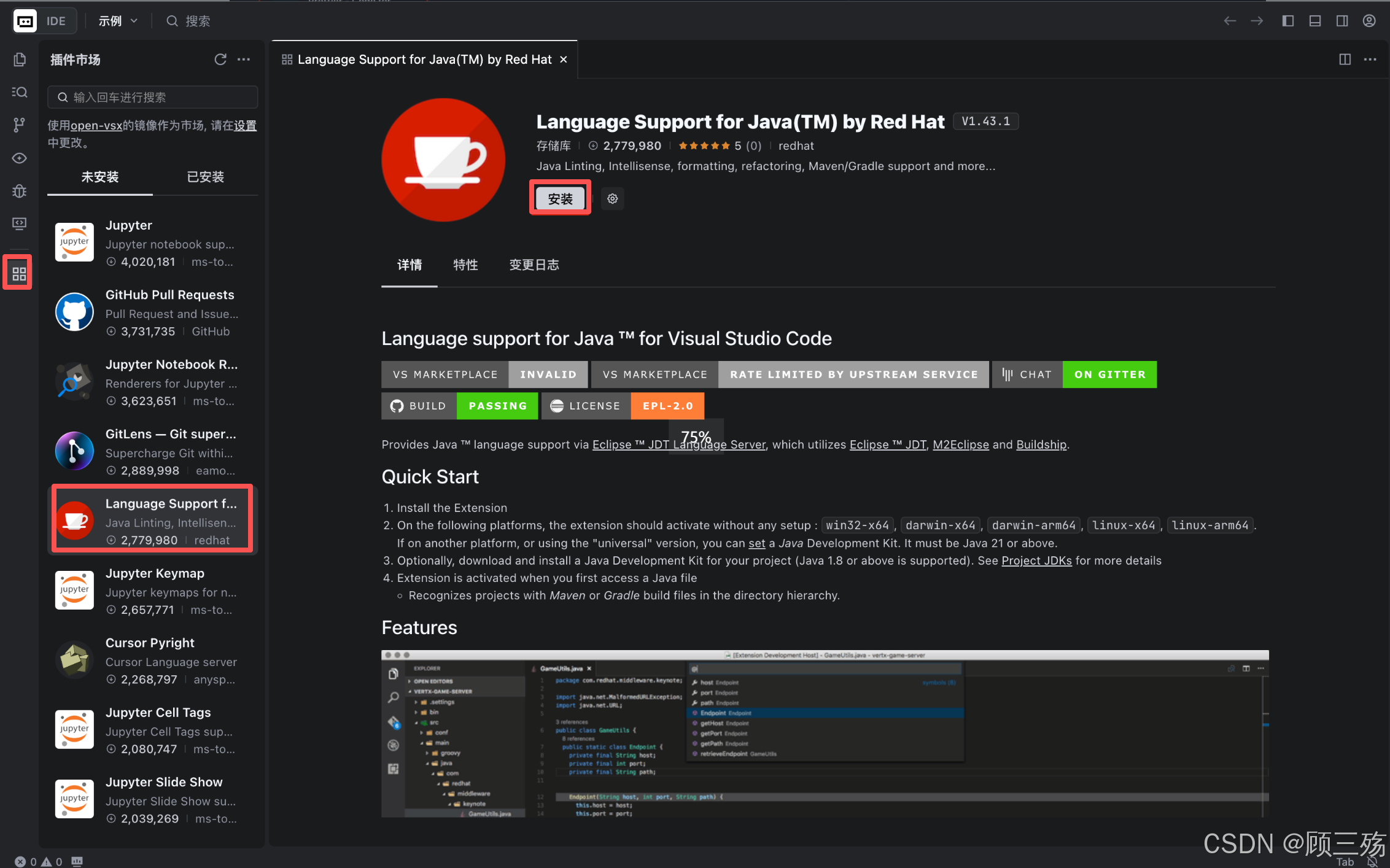 - 将下载的 .vsix 文件拖拽至 插件市场 面板中。