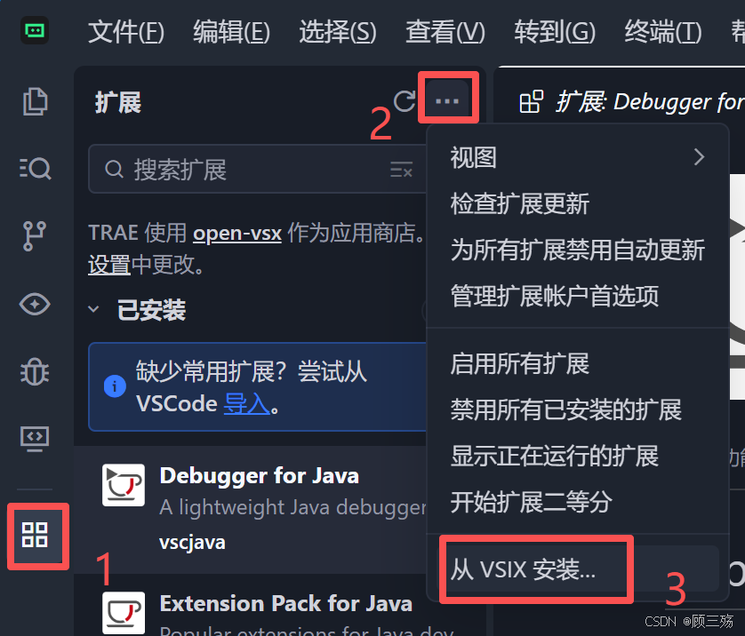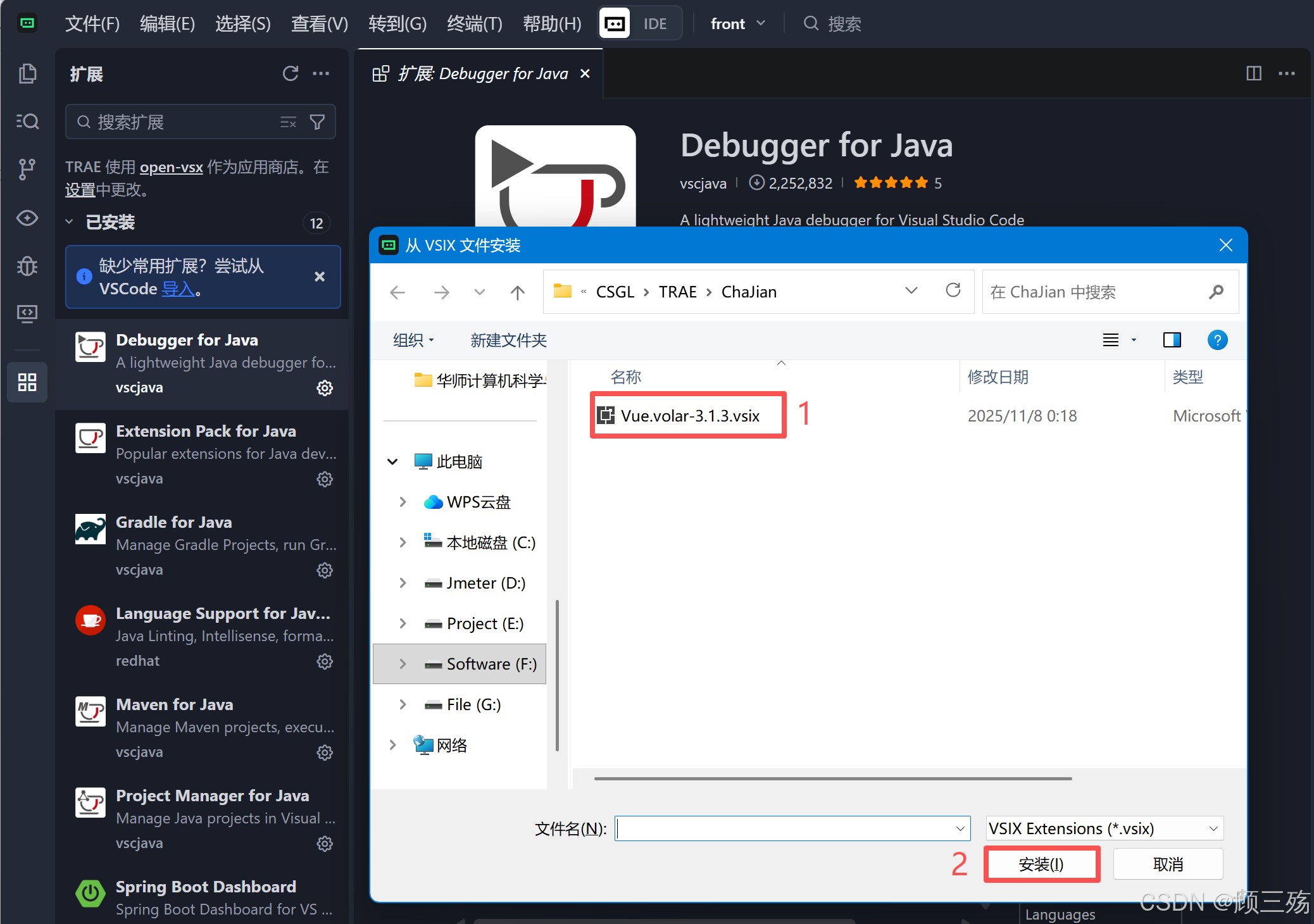 在弹窗中,选择目标 .vsix 文件导入至 TRAE IDE。
