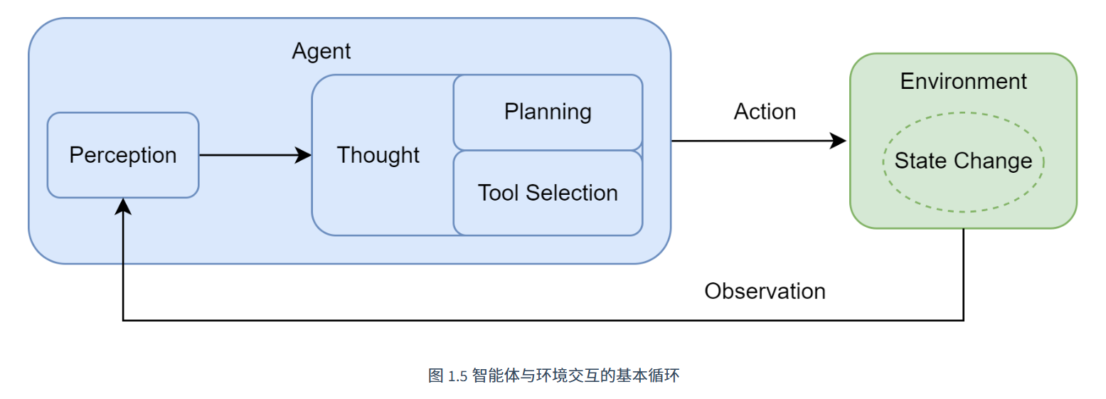 行动 (Action):决策完成后,智能体通过其执行器(Actuators)执行具体的行动。这通常表现为调用一个选定的工具(如代码解释器、搜索引擎 API),从而对环境施加影响,意图改变环境的状态。