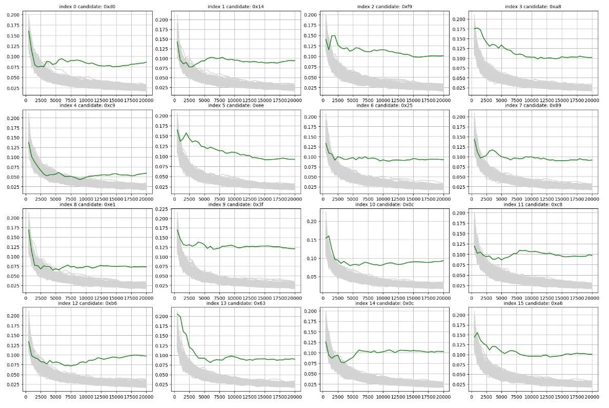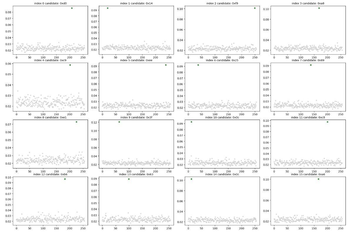 测试场景:100万条曲线,1万采样点,AES第一轮S盒输出HW攻击全部16字节密钥,float64精度,速度仅需996秒 (16分钟)。