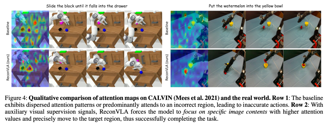 可视化显示,基线模型的注意力分散,而 ReconVLA 能精准聚焦于目标物体,如“将西瓜放入黄碗”任务中,注意力集中在西瓜上。