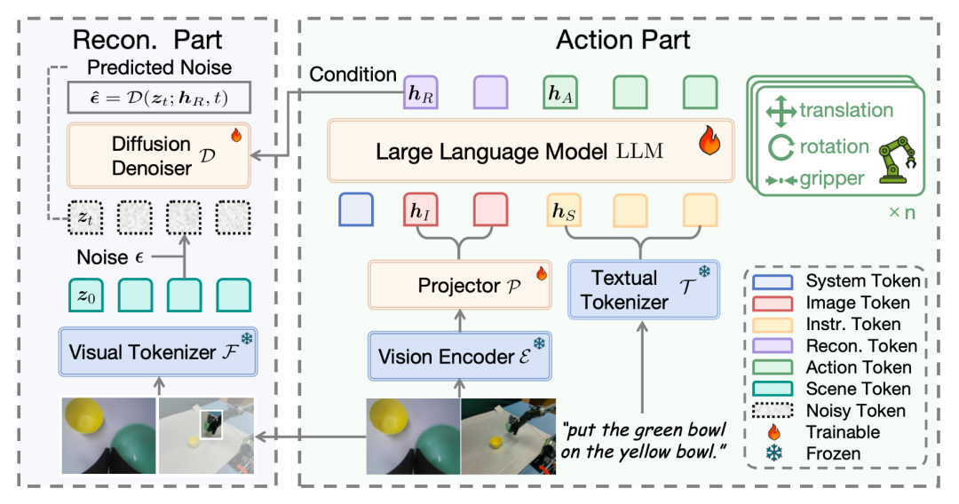其中 是由大语言模型基于视觉 tokens 生成的重构 tokens, 是扩散时间步, 是加入的噪声。这一设计迫使模型在生成动作的同时,必须学习对目标区域的精细视觉表征,从而实现隐式的视觉注意力聚焦。