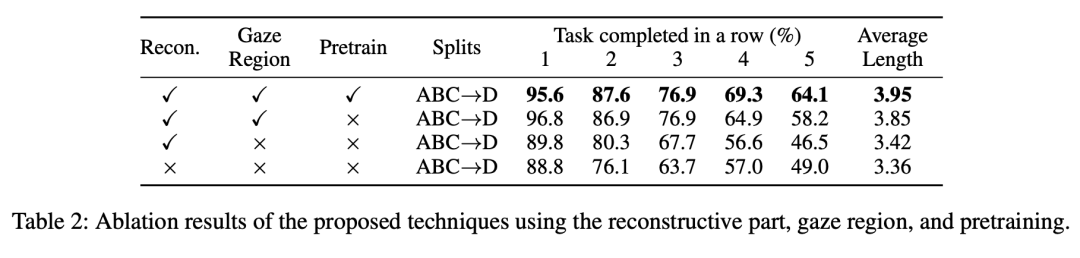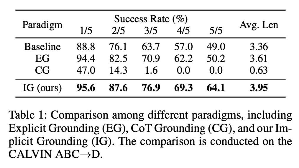 实验使用 CALVIN 基准,包含 34 个任务和 4 种环境,评估模型在长时序任务中的表现。指标为子任务成功率与平均完成长度。