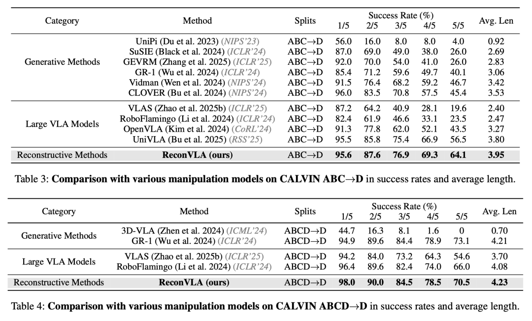 在 ABC→D 和 ABCD→D 任务中,ReconVLA 在多项指标上超越生成式方法(如 GR-1、3D-VLA)和大规模 VLA 模型(如 OpenVLA、UniVLA),尤其在长时序任务中表现突出。