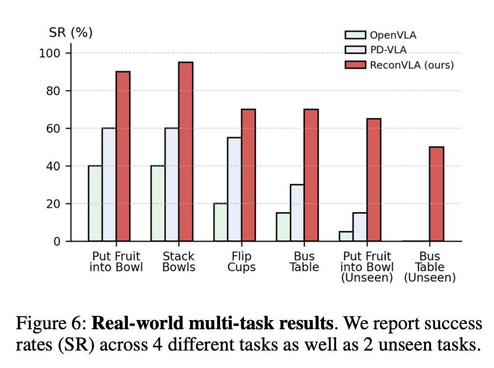 在四个真实任务(如叠碗、翻杯等)中,ReconVLA 在未见目标上仍保持高成功率,显著优于 OpenVLA 和 PD-VLA。