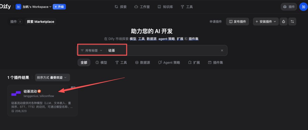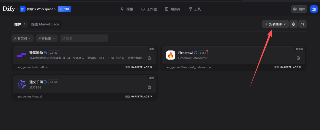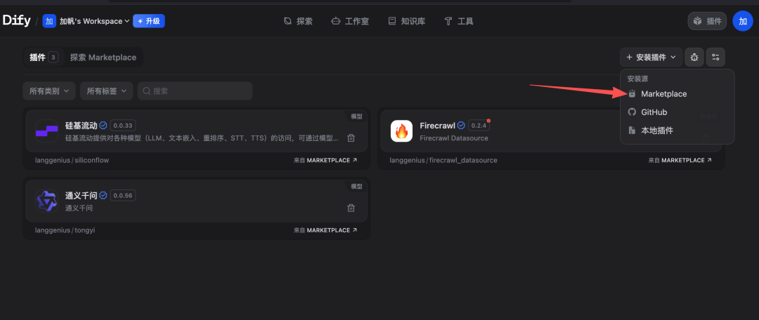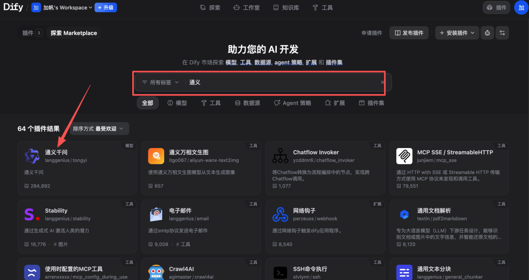 Dify 提供了丰富的插件,为了将我们的知识库接入大语言模型,我们通过插件市场可以安装到国内知名的大模型服务商