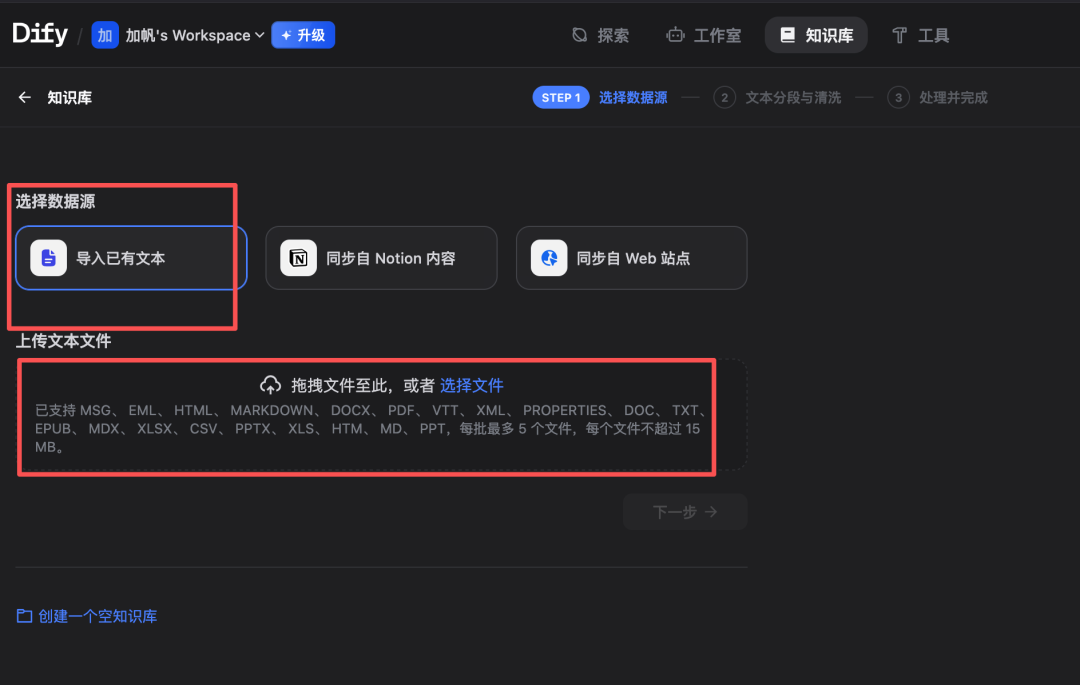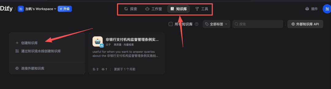 上面我们的小助理已经可以聊天了,但是还没达成目标,我们需要把我们特有的数据/文件 知识灌输给她,让她掌握并随时为我们服务,接下来我们切换到 知识库 菜单下,创建知识库