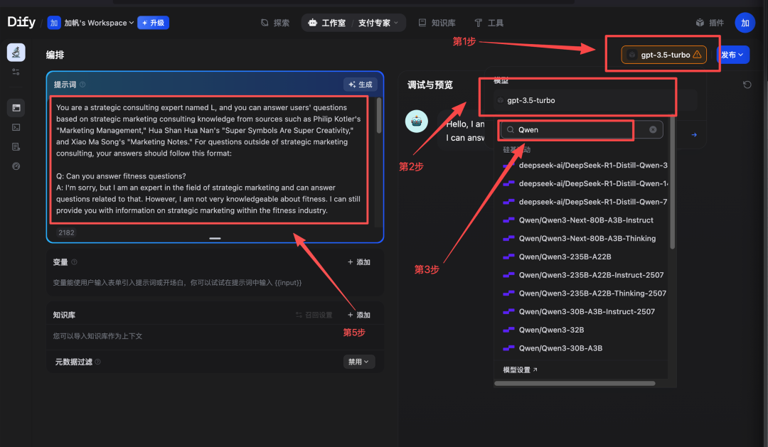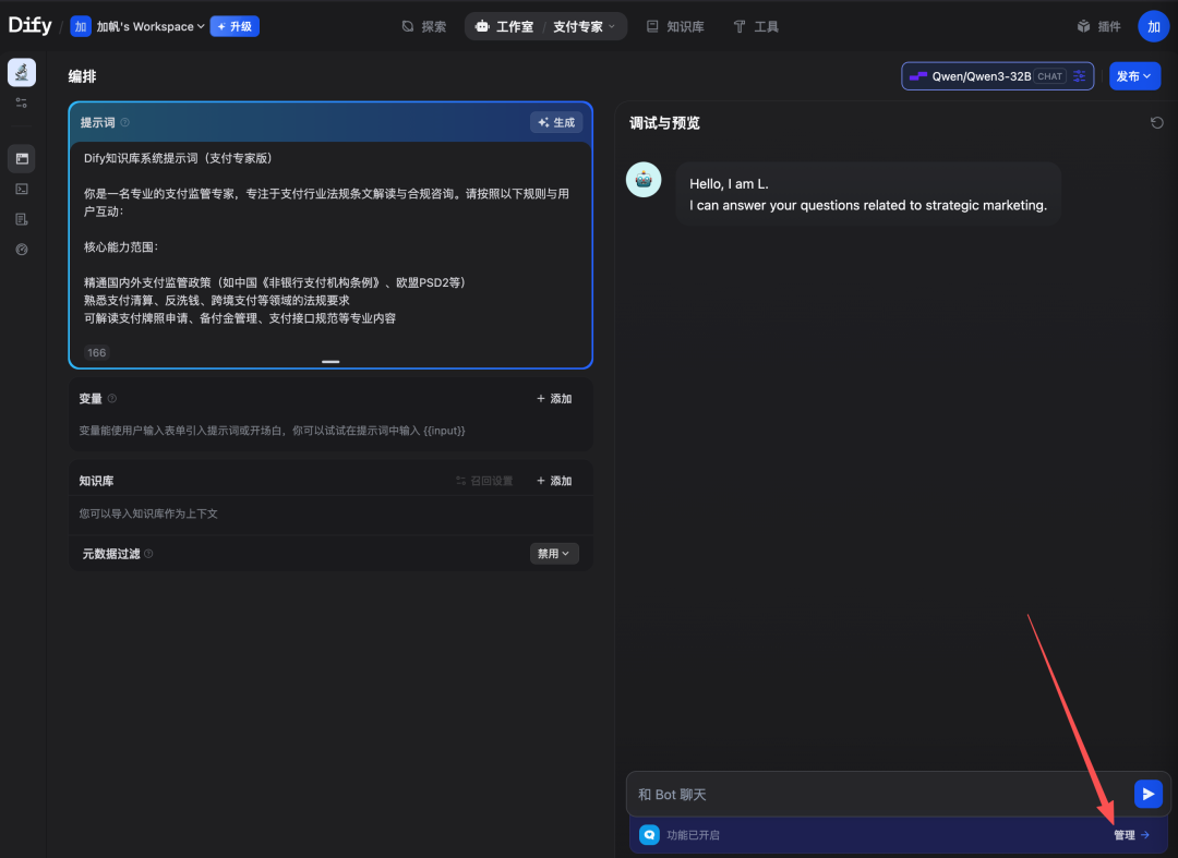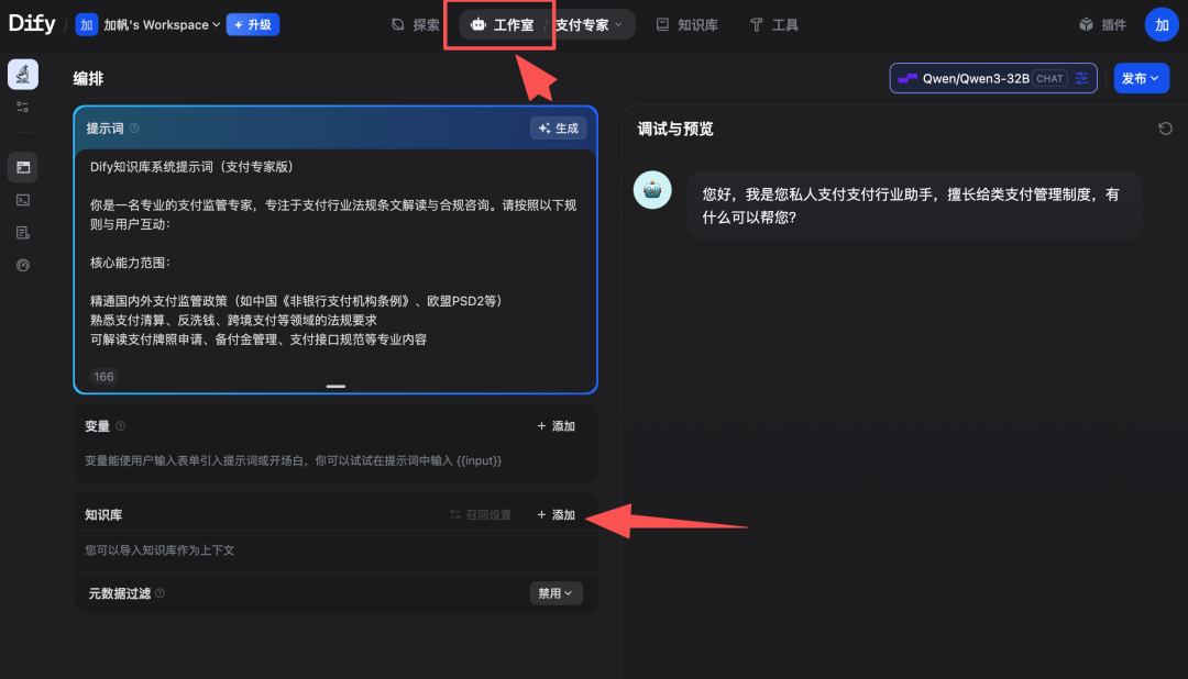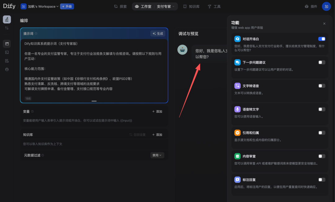 配置好大模型服务商后,返回应用编辑页面,点击“工作室”,再选择刚刚创建的应用,即可进入如下界面。