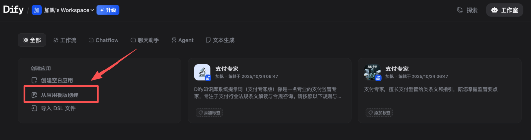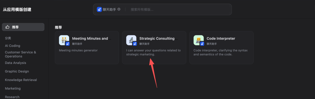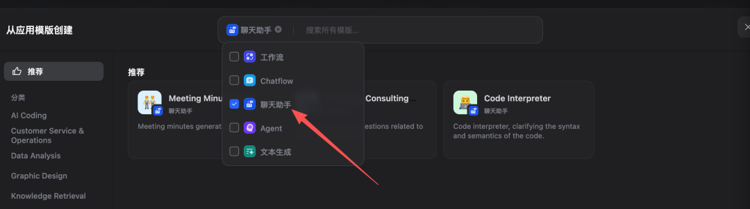 dify 官方提供了很多模板,我们首次体验从最简单的聊天助手开始,后续玩熟悉了可以选择其他的模板,或者从空白应用开始创建,实现高度定制