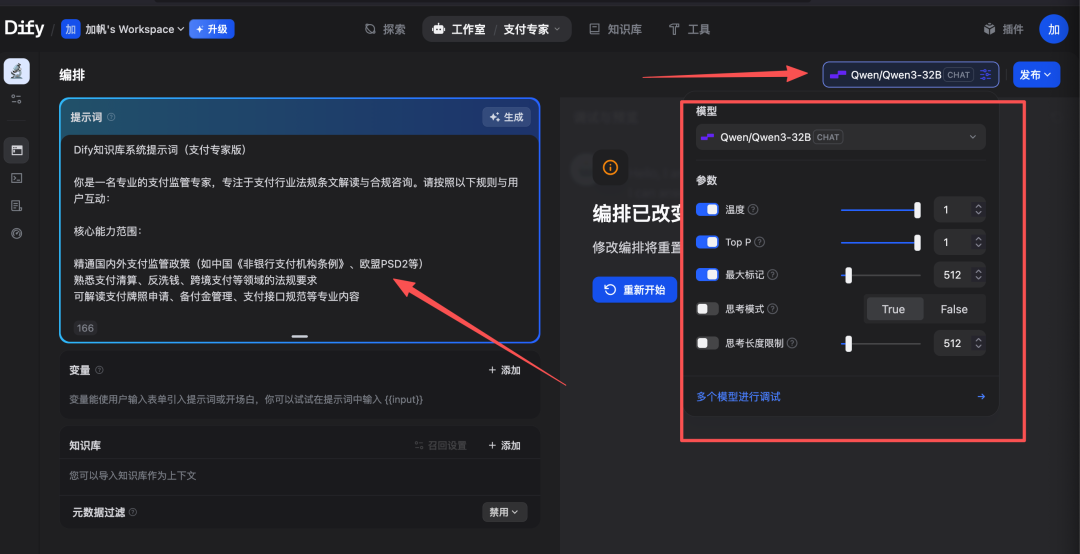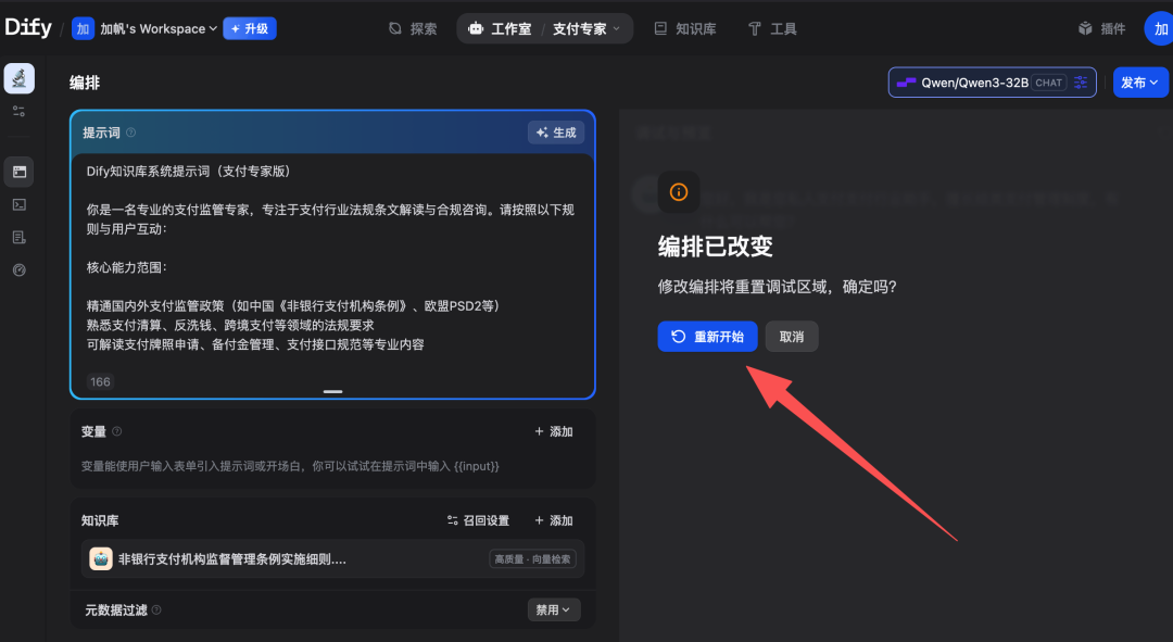 挂载好知识库后,系统会提示我们“编排已改变”,点击重新开始就行