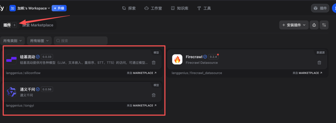 我这里已经安装好了 硅基流动和通义千问的插件,他们都可以提供数量可观的免费大模型额度