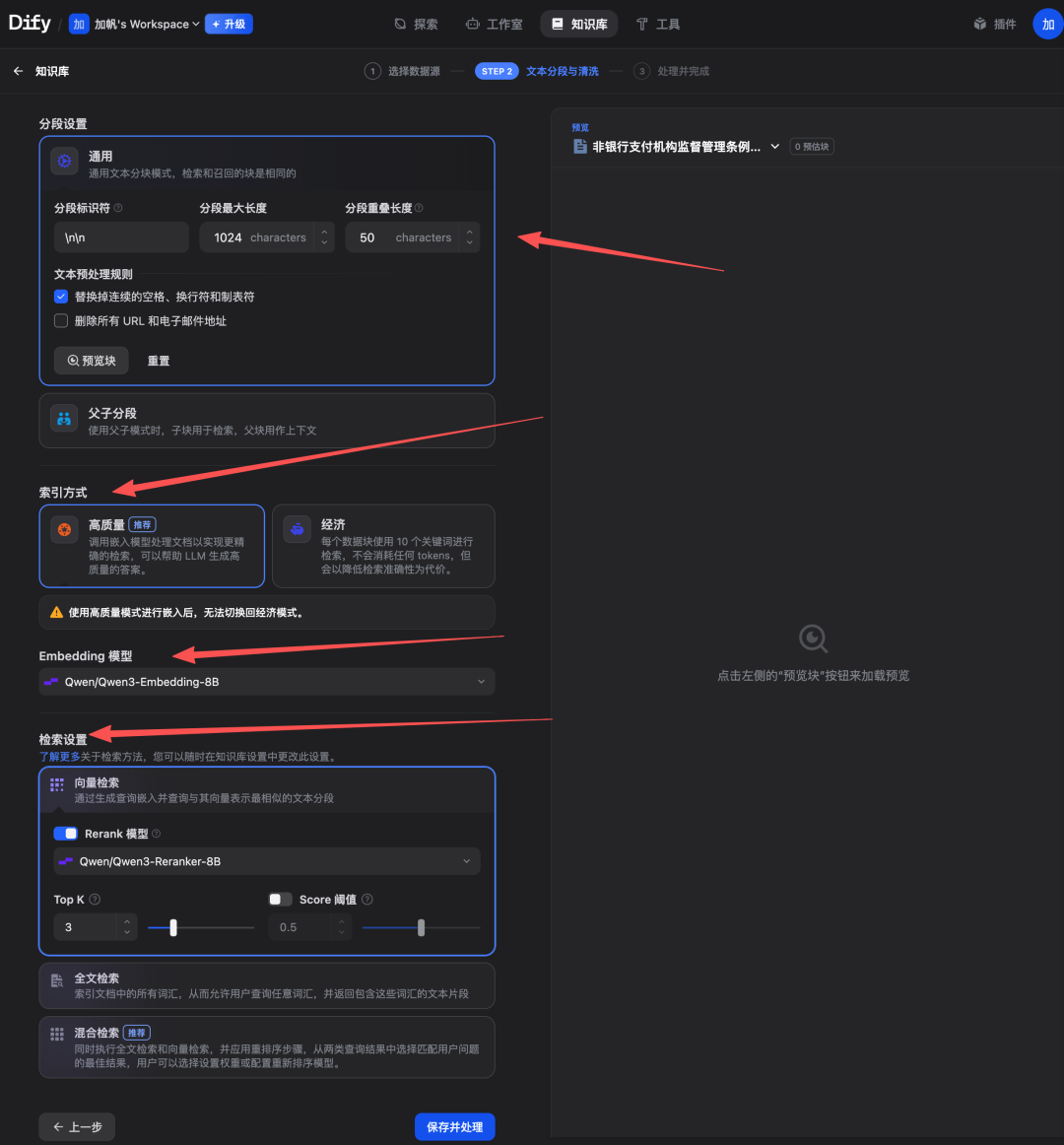 第三个Embedding模型:是把我们第一步的片段按照语义转化为数学上的向量,这个可以先不深究,后续我写RAG原理的时候,写详细一点,先随便选一个下拉框中出来的模型就好