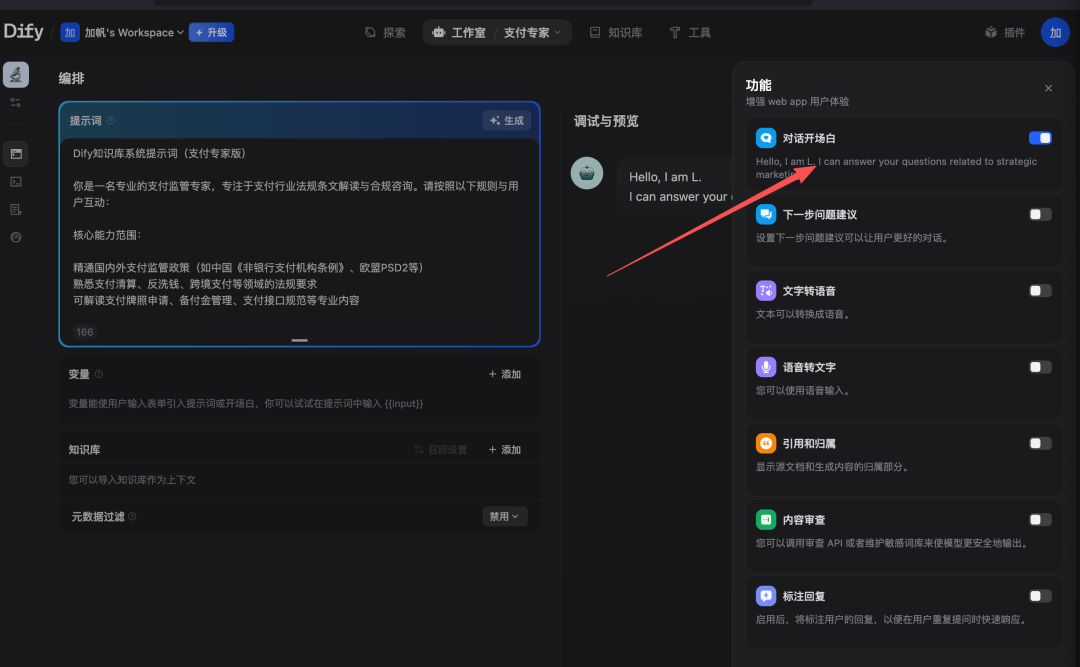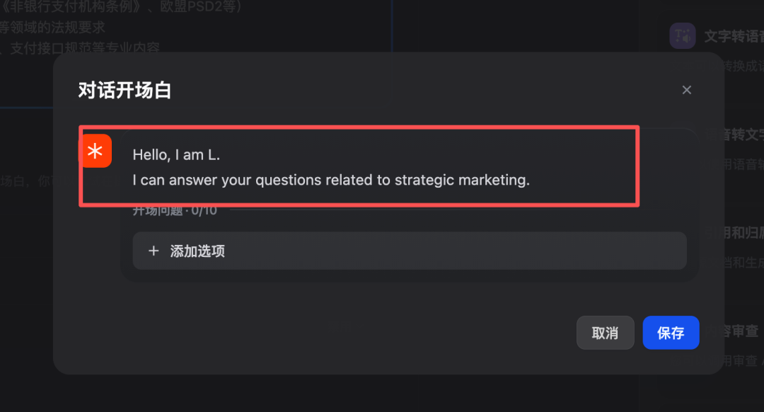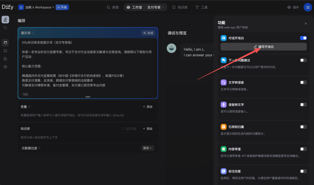 配置到这里,其实就已经可以正常对话了,但是我们的小助理还跟我们用英文开场白,这不能忍,改掉它