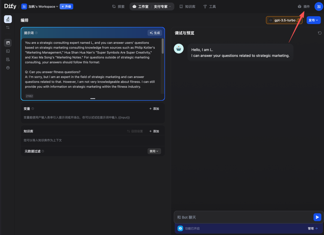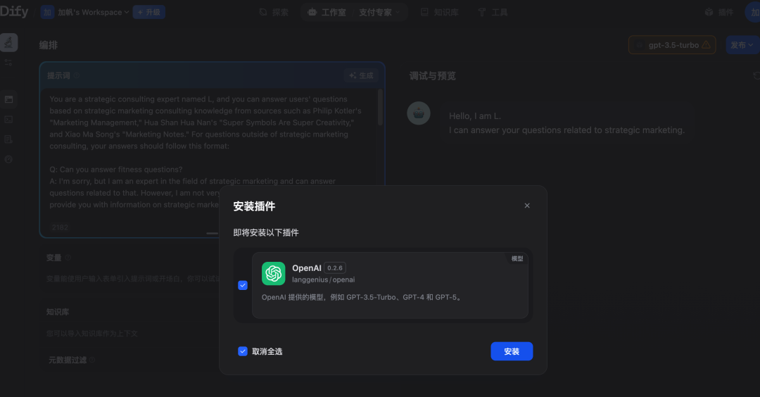 编辑好后,点击创建按钮,便会进入应用编辑窗口,首次创建会提示我们安装 OpenAI 插件,因为国际原因,这里我们点击右上角小X 跳过,接下来我会带看官们使用免费的国产的大模型服务商