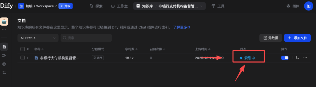 创建好后,dify 正在加紧帮我对文件进行分段分块,以及转化成数学向量等