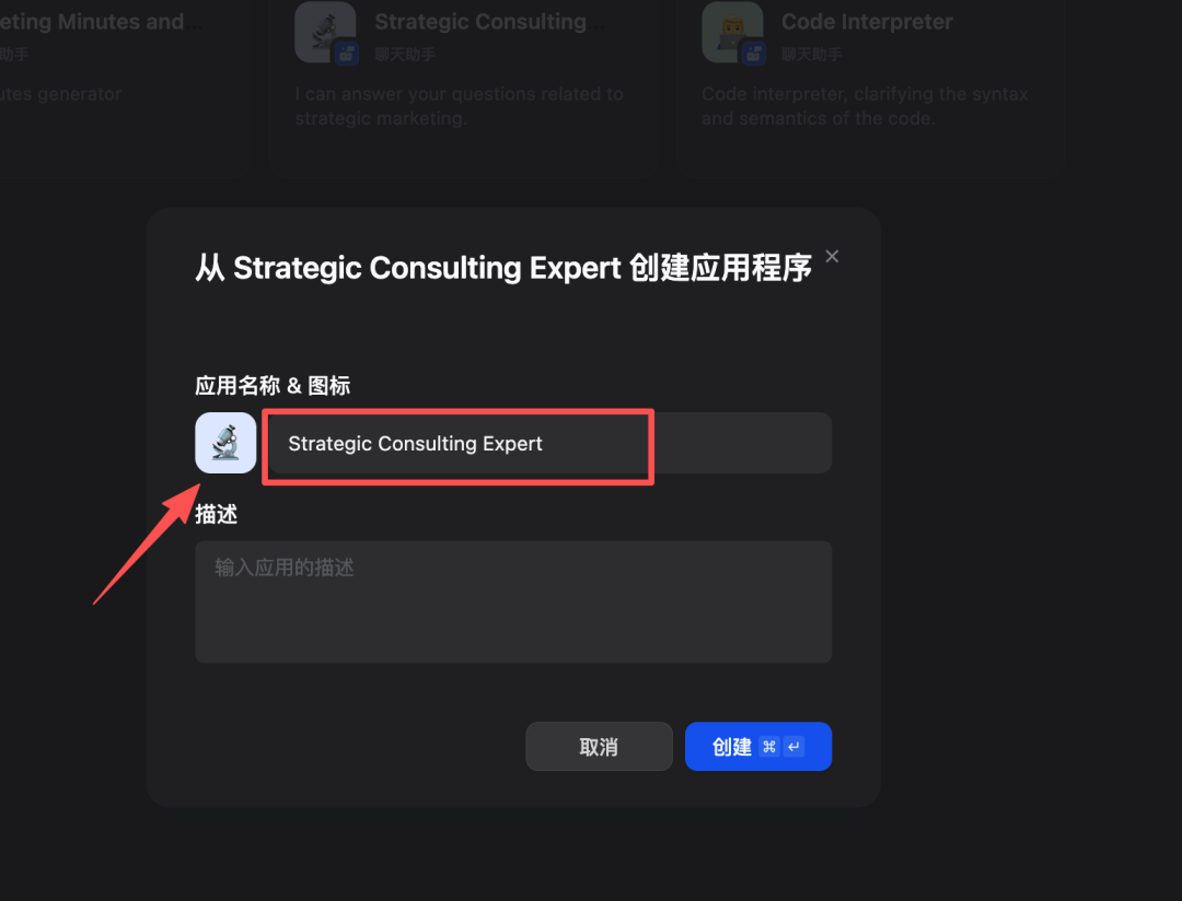 选择完模板后会有一个弹窗,让我们给我们的应用(未来的小助理)取一个响亮的名字,以及可选的描述介绍