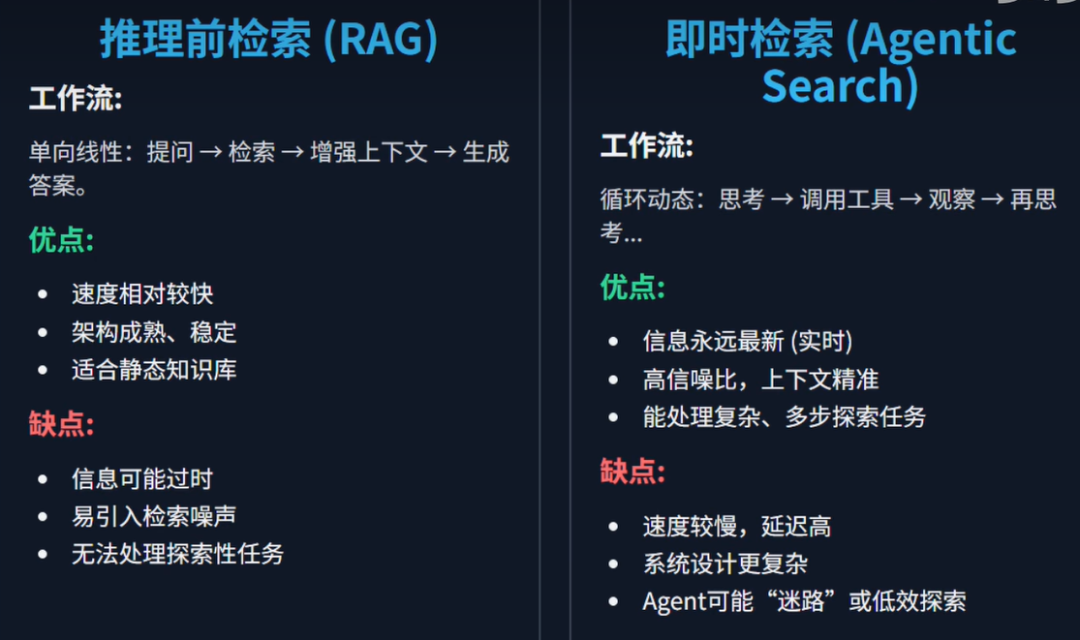 注:图片来源于B站up主:慢学AI的视频,名称为超越RAG的agentic search :从“被动投喂”到“主动探索”-Anthropic《AI Agent的高效上下文工程》,大家可以到B站搜索这个视频的详细讲解。