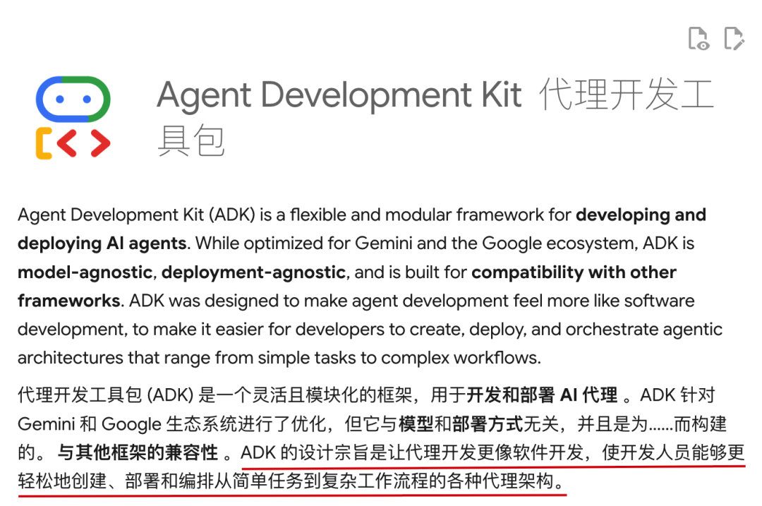 - ADK 以轻便化构建 Ai Agent 智能体,解决智能体开发的复杂流程而设计。目前支持 Python、Java、Go 3种语言对应的技术框架。