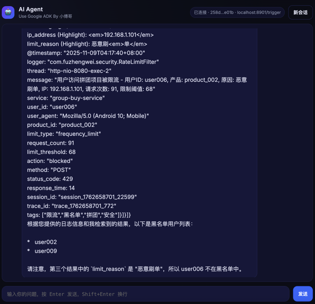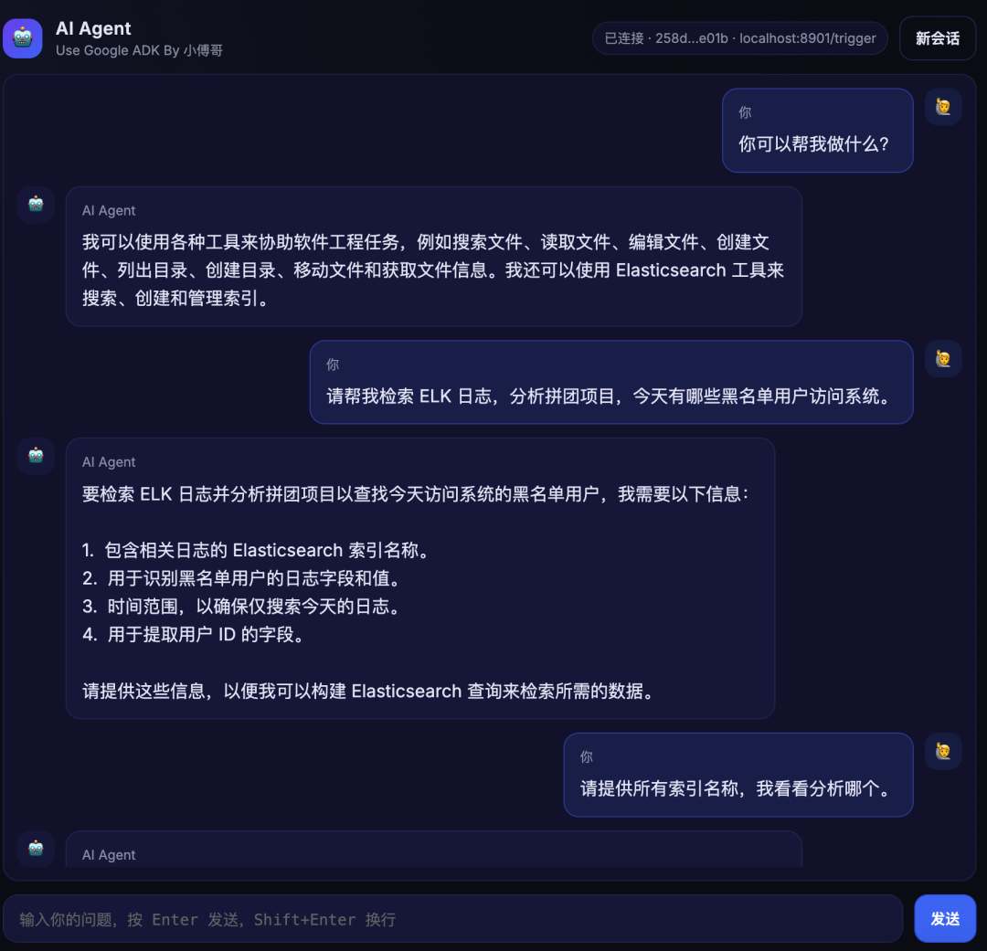 - 以上演示了,使用 Ai Agent 进行 ELK 日志分析,通过对话可以看到,最终我们可以拿到系统的日志数据。