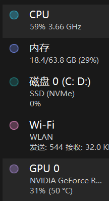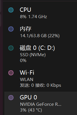 在任务管理器中可以看到没有询问模型的cpu和gpu占用情况: