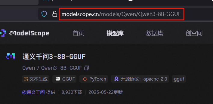 模型的安装也很简单,魔搭社区就支持ollama的命令行一键下载模型,所以我们找一个gguf格式的模型,复制这个网址。