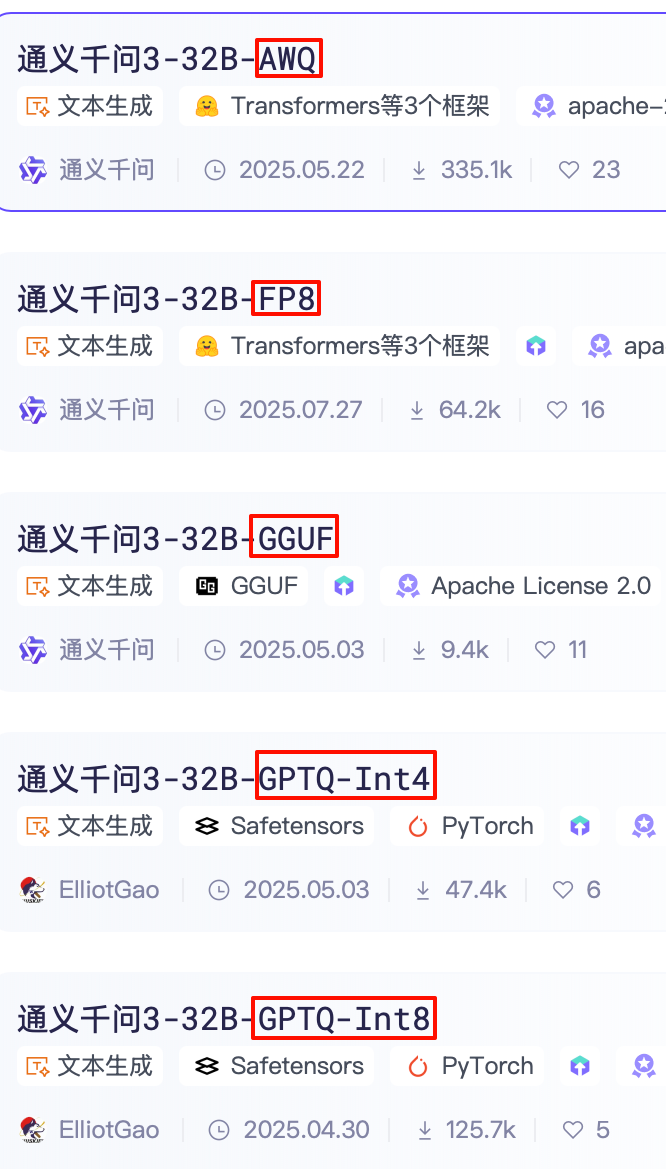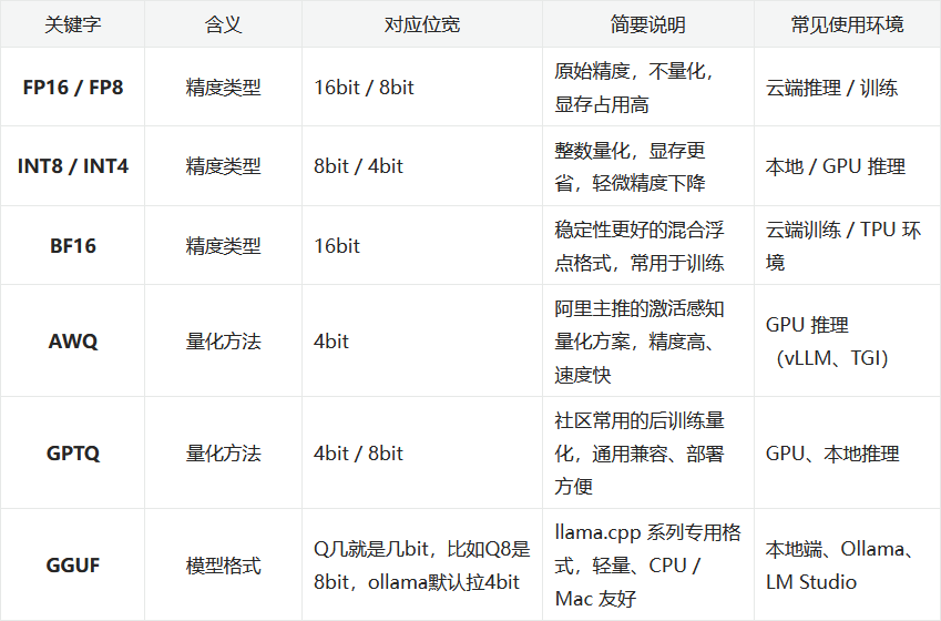 通过上图圈起来的部分,可以看到32B参数的qwen3文本对话模型的名称中包含,AWQ、FP8、GGUF、GPTQ,这些模型标识,对应的含义大家可以看下面这幅图: