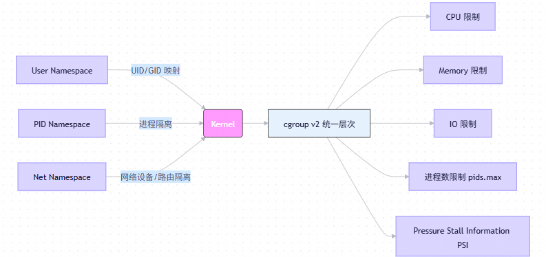 | User Namespace (User) | 实现用户和组 ID 的映射隔离,提升权限控制粒度 | CLONE_NEWUSER |