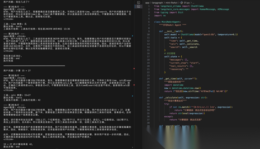 从运行截图可以看到,这个极简ReAct Agent展现了ReAct范式的工作原理:当用户问"现在几点了?"时,Agent会推理出需要调用时间工具;当用户问"什么是人工智能?"时,Agent会直接回答而不调用工具。整个示例代码实现了推理→行动→观察→回答的完整循环。