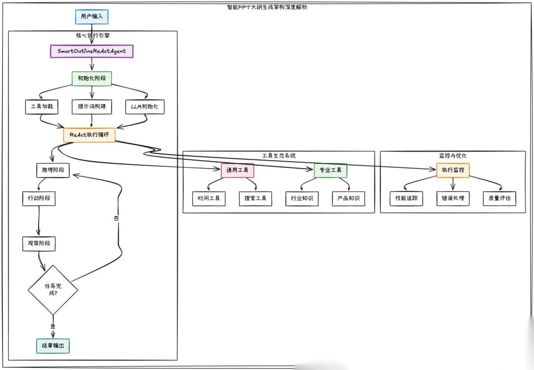 了解 LangGraph的设计原理后,让我们通过一个真实的项目案例来看看ReAct在实际应用中的价值。这个案例来自智能解决方案系统,其中PPT生成大纲是其中的一个重点能力。