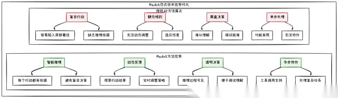 ReAct范式之所以有效,在于它解决了传统AI方法的几个问题: