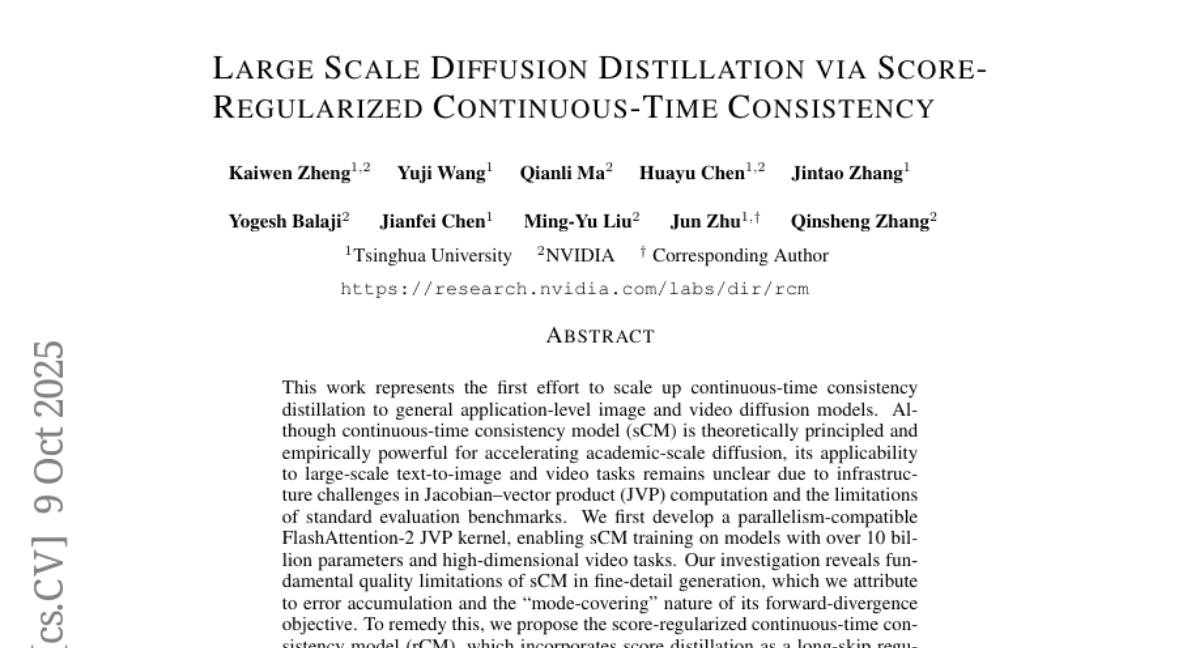 这项由清华大学和NVIDIA团队联合完成的研究发表于2025年10月,论文编号为arXiv:2510.08431。领导这项研究的包括清华大学的郑凯文、王雨季、陈华宇、张金涛、陈建飞和朱军教授,以及NVIDIA的马倩丽、巴拉吉、刘明宇和张钦盛等研究员。这是第一个成功将连续时间一致性蒸馏技术扩展到大规模图像和视频生成模型的研究成果。