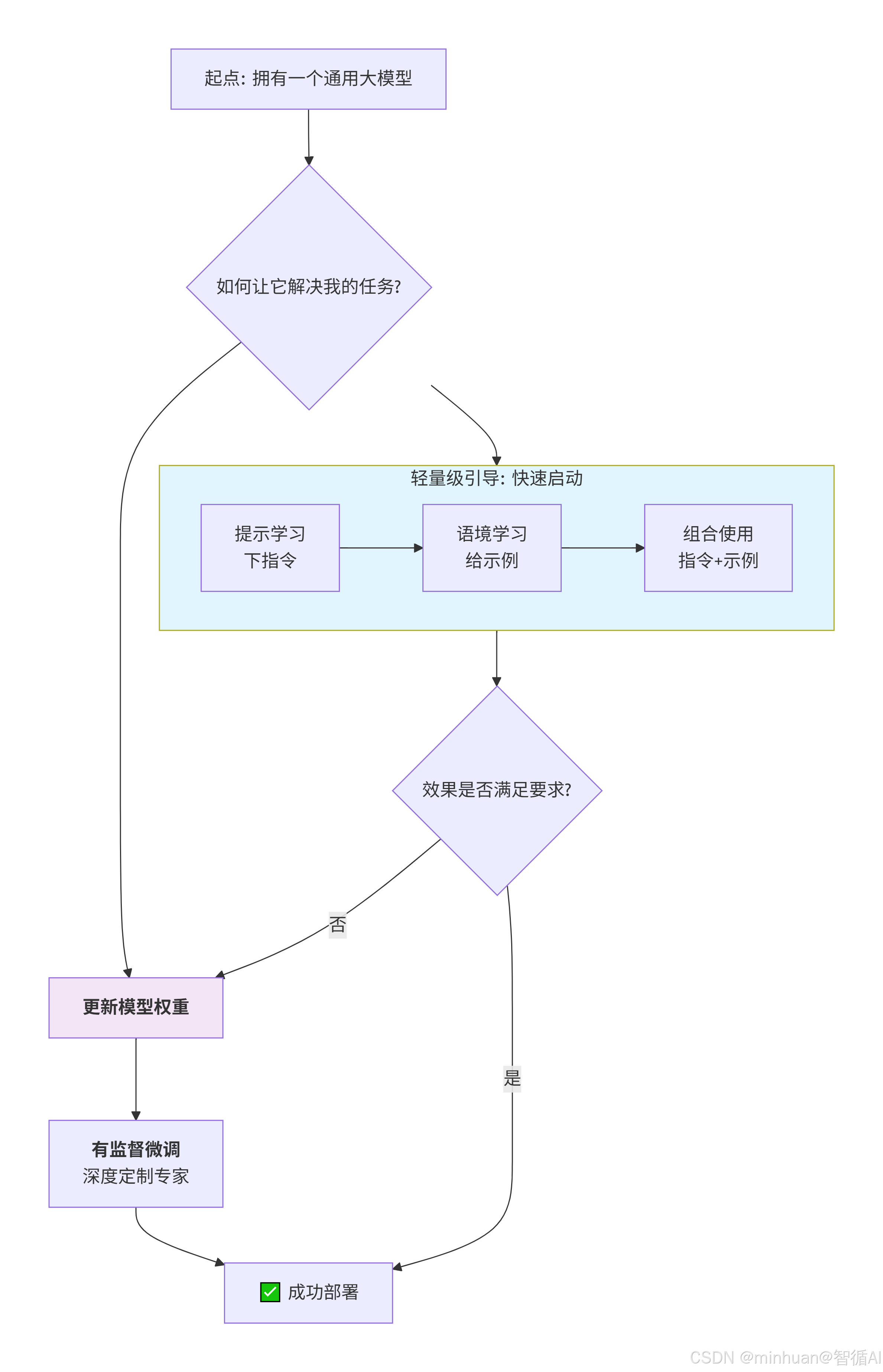- 提示学习 & 语境学习(轻量级引导):如上图左侧所示,它们位于同一层级,都属于不更新模型权重的方法。只是在模型的“输入端”做文章,通过改变输入信息(指令或示例)来引导或激发模型产生你想要的输出。模型本身的知识和能力并没有被改变,就像给同一个员工不同的工作说明书。