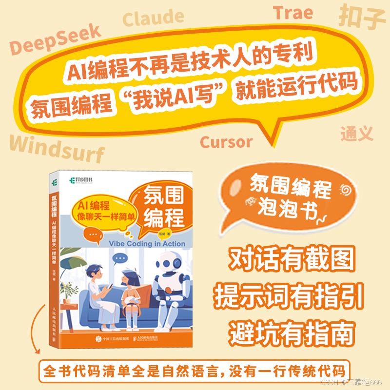 接下来给大家推荐一本关于Vibe编程的书籍,这是一本关于如何在AI时代用Vibe新范式开发应用的干货图书,一经上市就登上了当当“计算机与互联网”图书排行榜前列。本书从Vibe编程原理解析讲起到实战技巧,助开发者在日常AI全栈实战工作中轻松提效!另外,关注本文博主,点赞+收藏本文,且在本文评论区评论“入手Vibe”,将选取三名幸运读者送出纸质版《Vibe编程:探索AI时代编程新范式》一本,截止时间:2025.09.09。入手《Vibe编程:探索AI时代编程新范式》传送门:https://item.jd.com/15131686.html 或者 https://product.dangdang.com/29934757.html ,个人觉得这本书非常的不错,是一本不可多得的好书,值得拥有去学习。
