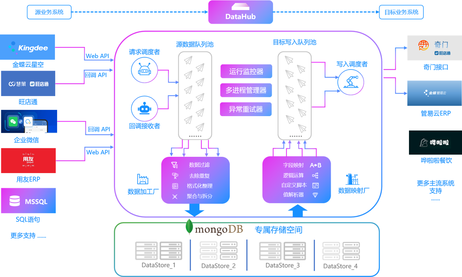 轻易云数据集成平台:轻量化部署支持快速扩展,但功能深度有限,复杂扩展时可能面临瓶颈。其智能连接中枢预置专用适配器,减少了扩展时的配置工作量。