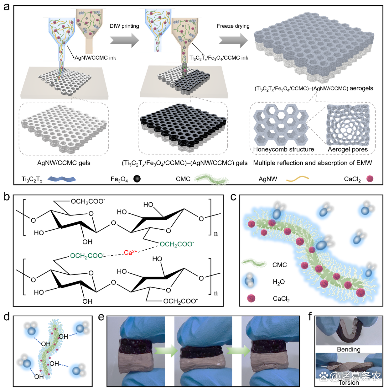 (Ti3C2Tx/Fe3O4/CCMC)–(AgNW/CCMC)气凝胶的制备流程示意图