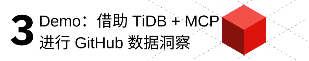 在 OSSInsight (https://ossinsight.io)项目中,我们已使用 TiDB 存储了超过 90 亿条公开的 GitHub 事件数据,通过预设 SQL 为用户提供在线分析报告。如今,数据分析类应用的开发模式也正在发生改变。借助 TiDB 提供的 MCP Server 能力,开发者可以: