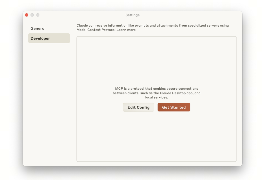 - 配置 MCP 客户端(以 Claude Desktop 为例),添加 TiDB MCP Server 的配置参数:找到 Settings -> Developer配置,通过Edit Config 按钮打开 MCP 配置文件