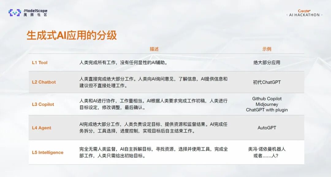 而 Agent 的话,其实需要 AI 完成更多工作,人类主要负责设定目标、提供资源、监督结果。Agent 需要自主完成任务拆解、工具选择、进度控制,实现后自主结束工作。