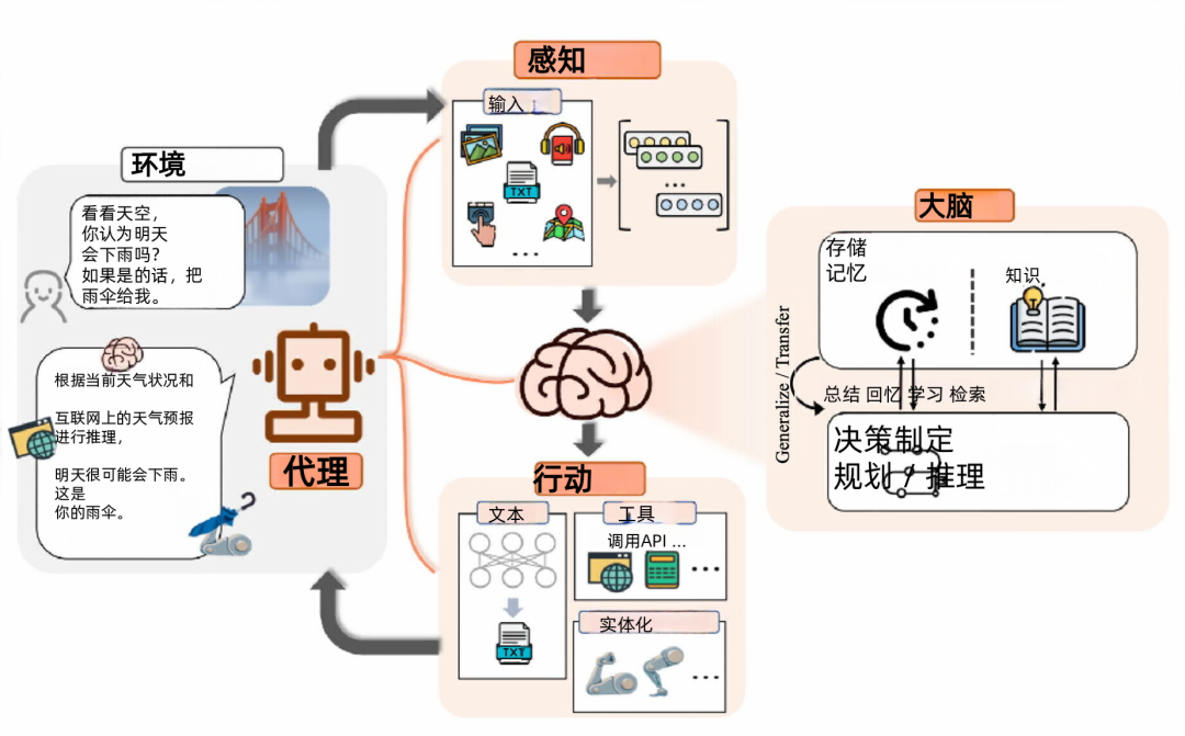 它可以感知环境,获取输入可能是文本、图片、视频、音频等。它有“大脑”可以进行规划、存储,也能执行各种行动,包括输出文本、调用工具、操作机械臂等。