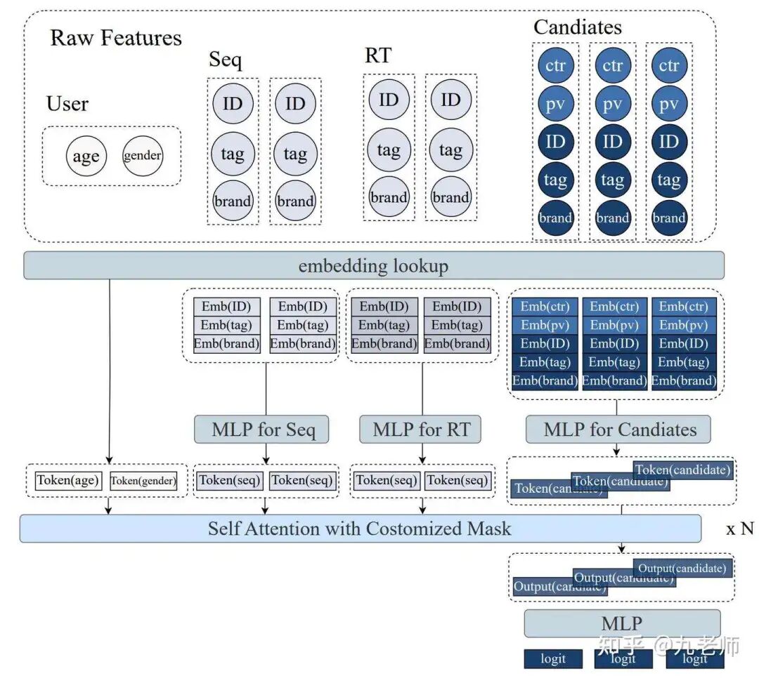 类似的思路,年中的时候,美团发了MTGR。从下面这张架构图上,核心思想是非常一致的,所以我们以上谈到的观点并非独有,实际也有其他人在选择突破序列压缩瓶颈。不过即便今天来看,无论是公司内还是业界,把统一序列和特征并采用简洁的单一网络结构落地全量的,还是屈指可数的。