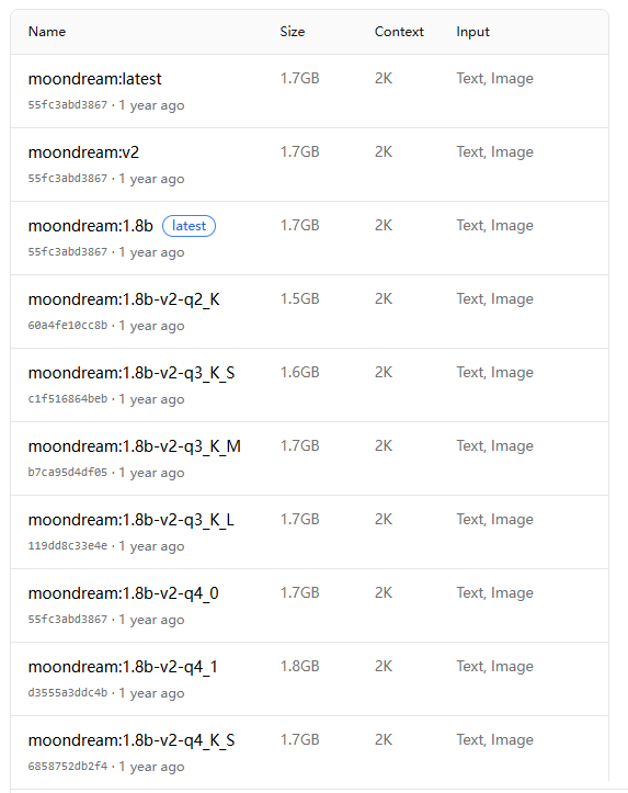 目前,标准的 Moondream 模型主要通过 Hugging Face (https://huggingface.co/vikhyatk/moondream2)的 transformers 库在 Python 环境中使用。好在 Moondream 已被ollama官方库收录,以其统一的方式管理使用模型变得非常简单。