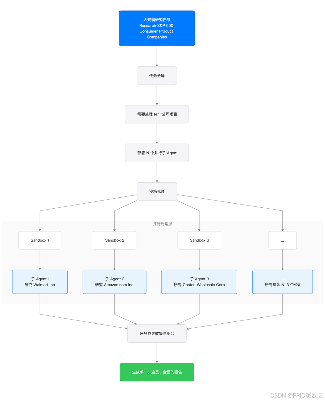 Agent 的并行计算不是要求一个处理器顺序处理 n 个项目,而是像影分身那样部署 n 个并行子Agent 同时处理 n 个项目,然后将子 Agent 的任务成果综合成一个单一的、连贯的、全面的报告。