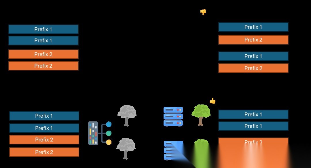 - RadixAttention[7] :利用Radix树管理KV缓存的前缀复用,通过LRU策略和引用计数器优化缓存命中率。与传统系统在生成请求完成后丢弃KV缓存不同,SGLang系统将提示和生成结果的缓存保留在基数树中,实现高效的前缀搜索、重用、插入和驱逐。这种技术使得SGLang在多轮对话和规划任务中表现突出,测试显示在Llama-7B上跑多轮对话,吞吐量比vLLM高5倍。