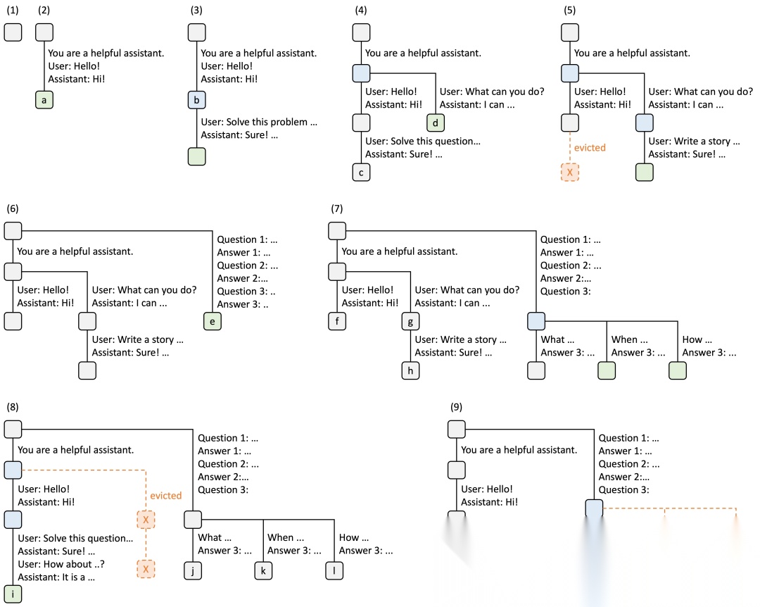 RadixAttention 操作示例,采用 LRU 驱逐策略,展示了九个步骤