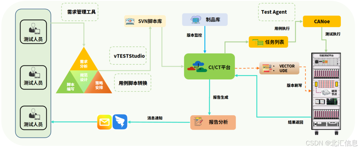 CI/CT与系统测试结合可以确保软件的功能安全和合规性,测试人员需要根据测试需求完成测试规范设计,测试脚本的编写以及测试策略的安排(冒烟测试或全功能测试等),当CI/CT服务器检测到脚本或者制品库有更新,会自动化的根据测试任务列表执行HIL台架测试。当软件版本和台架版本不一致的时候,会触发自动刷写流程,完成刷写后继续执行测试,测试结果将由CI/CT调度通过邮件或者第三方通讯工具发送给测试人员。